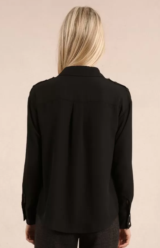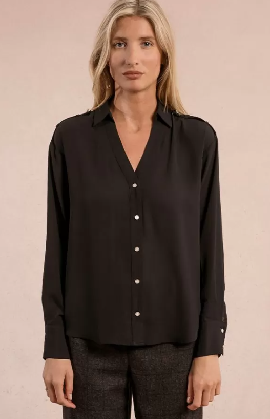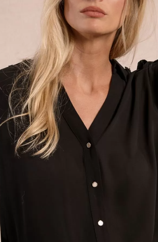 Chemise fluide en semi-transparence -Manches longues -Larges poignets resserrés et boutonnés -Pattes d'épaule décoratives et boutonnées -Col chemisier réhaussé d'un décolleté en V -Fermeture par boutons fantaisies sur le milieu devant -Coupe droite