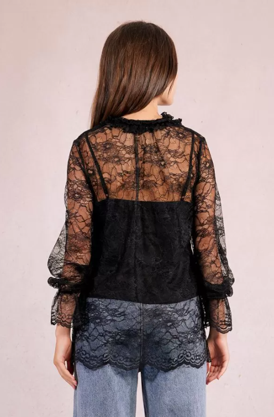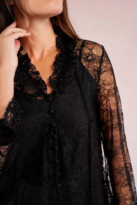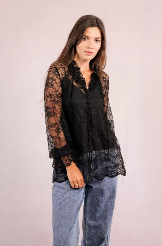 -Chemise en voile dentellé, transparente -Doublée d'un caraco amovible -Manches longues ballon, poignets resserrés -Encolure V, réhaussée d'une bande de dentelle festonnée, lien en ruban à nouer sur le décolleté -Fermeture par boutons recouverts sur le milieu devant -Finitions festonnées
