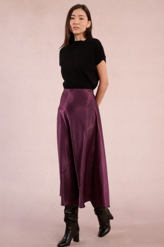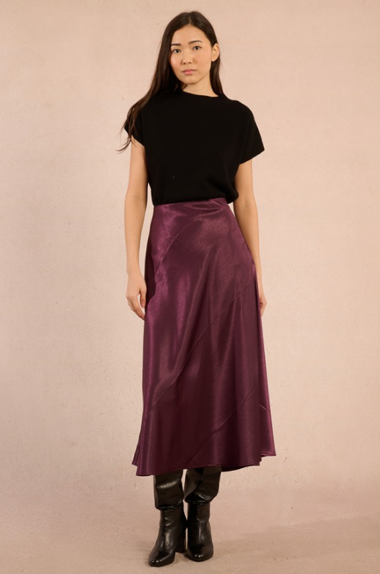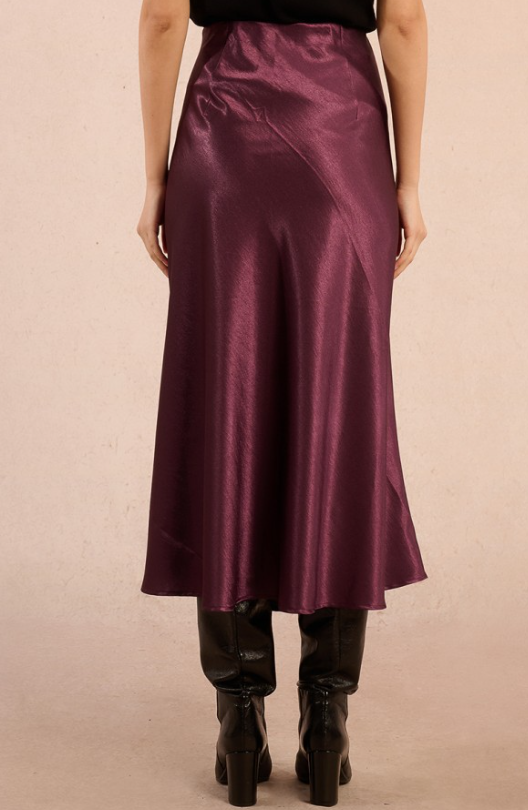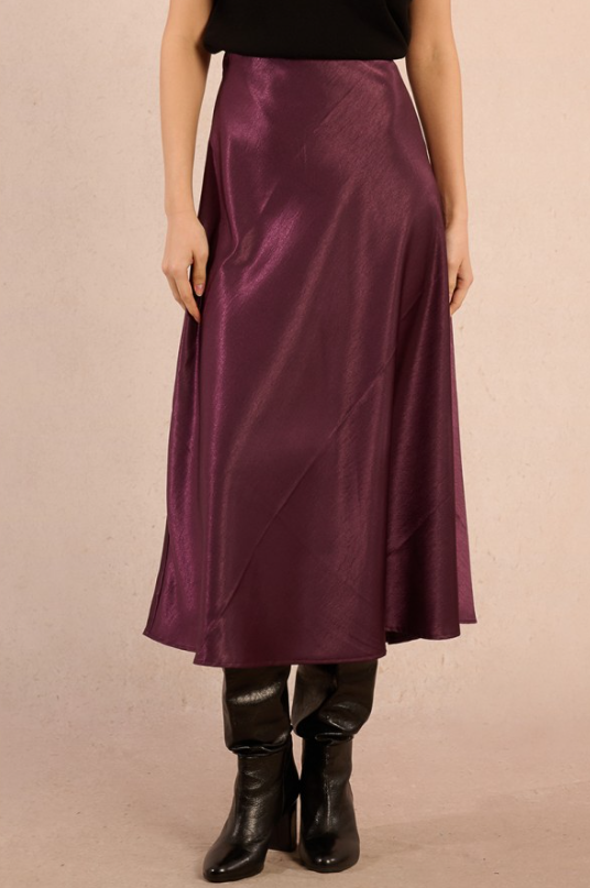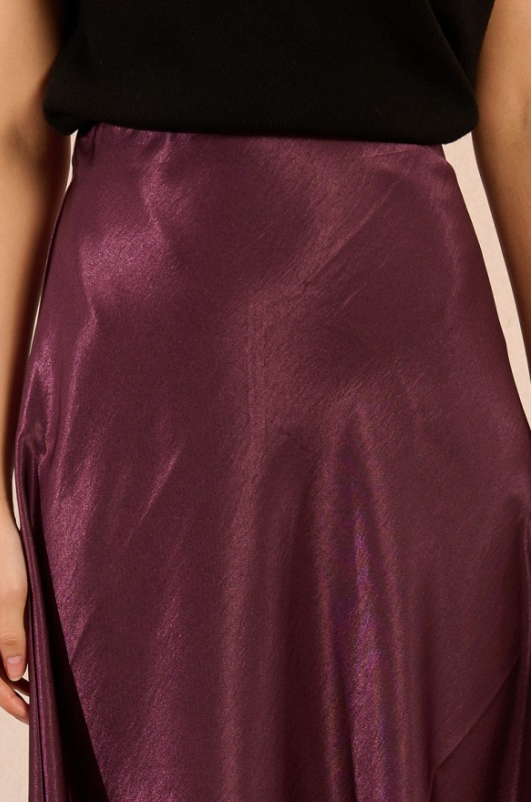 -Longue jupe satinée -Taille haute, élastiquée -Coupe évasée -Fermeture par zip invisible