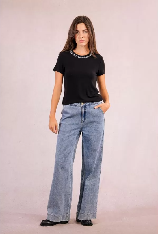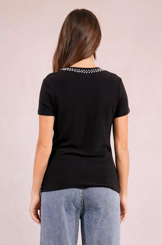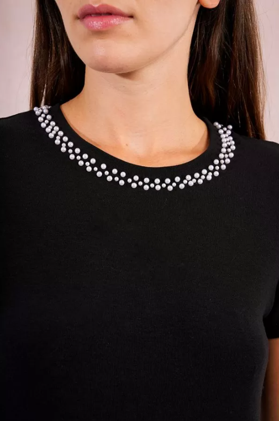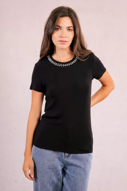 -T-shirt droit -Manches courtes -Encolure ronde soulignée de perles