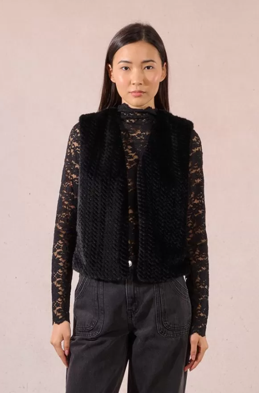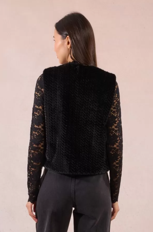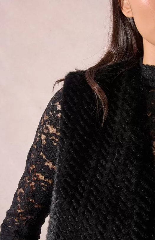 -Gilet sans manches en fausse fourrure -Découpe fourrure en zigzag -Coupe droite et courte -Encolure V -Ouverte sur le milieu devant -Doublée