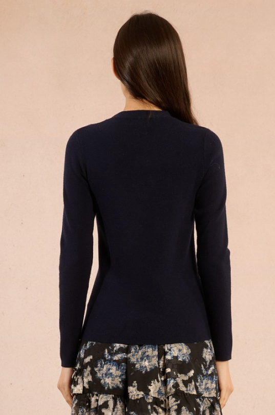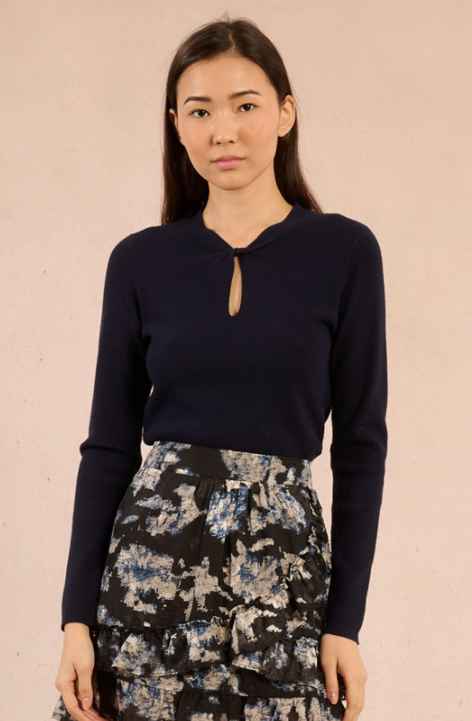 -Pull fin en maille -Manches longues -Encolure ronde vrillée -Ouverture en forme de goutte sur le décolleté -Coupe ajustée