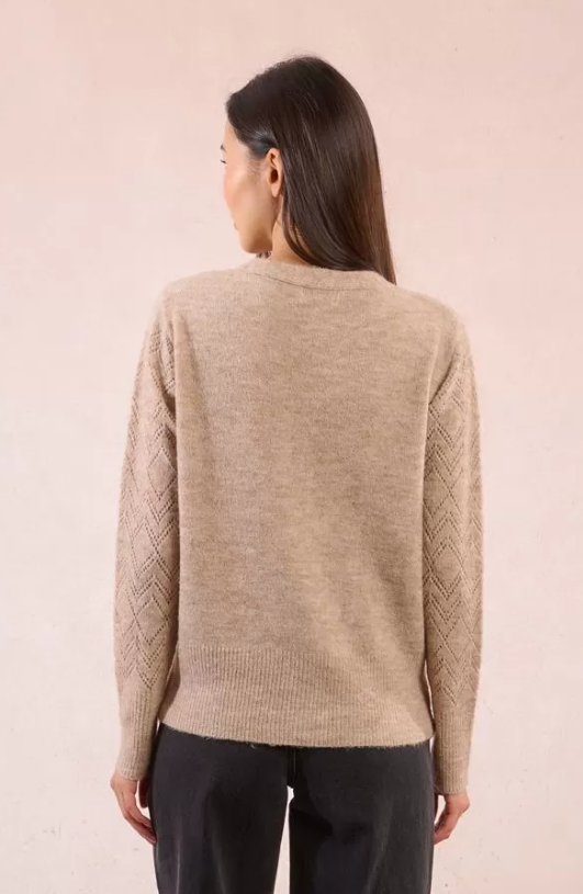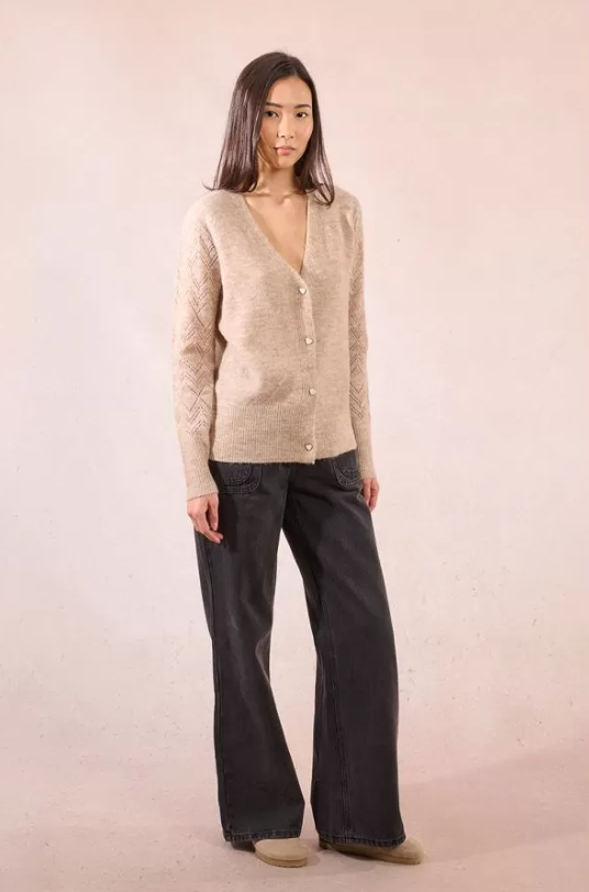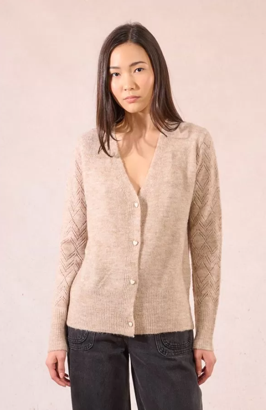 Gilet fin en maille -Manches longues ajourées -Poignets resserrés -Large encolure V -Fermeture par boutons fantaisies sur le milieu devant -Coupe ajustée