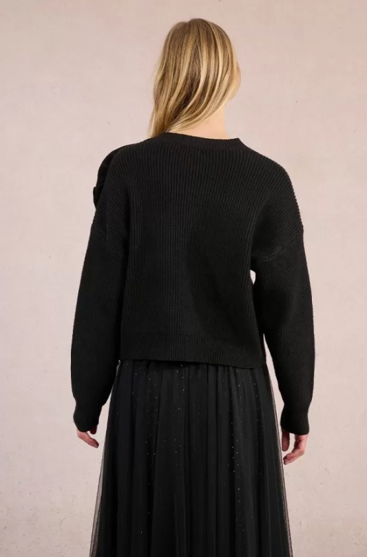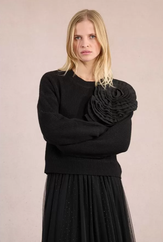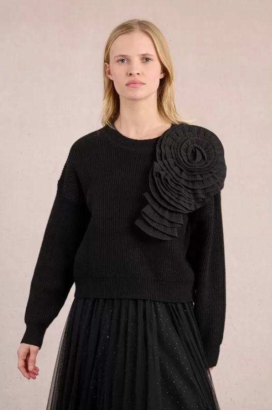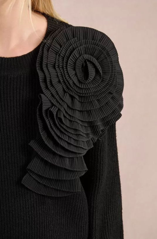 Pull court en maille -Manches longues -Encolure ronde proche du cou -Rose en relief sur l'une des deux épaules -Coupe droite
