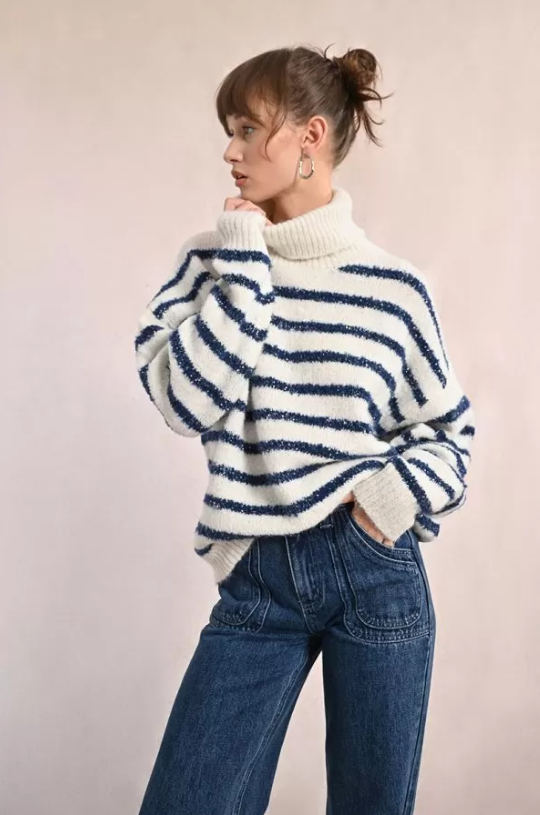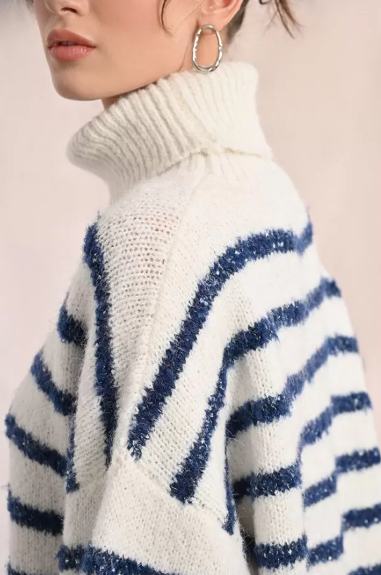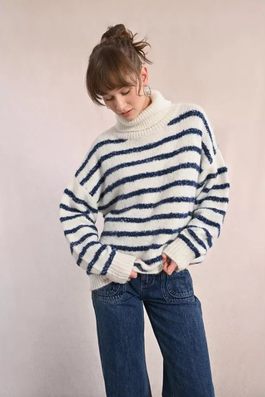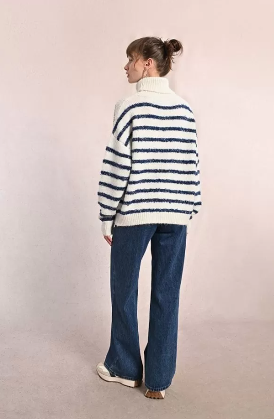 "-Pull en maille texturée -Rayures avec insert fils irisés -Manches longues, poignets retroussés -Large col roulé -Coupe droite -Finition côtelé