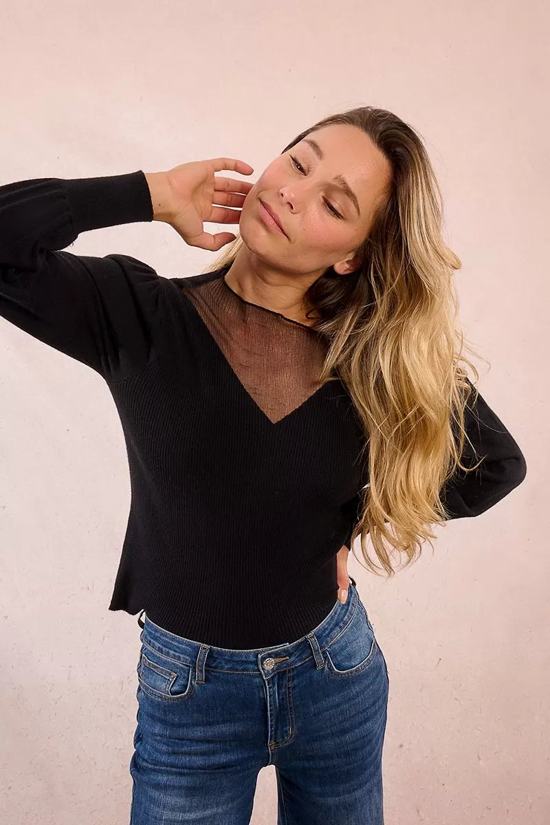 -Pull fin en maille -Manches longues bouffantes -Larges poignets resserrés -Encolure V -Col semi-montant en semi-transparence -Coupe courte et ajustée