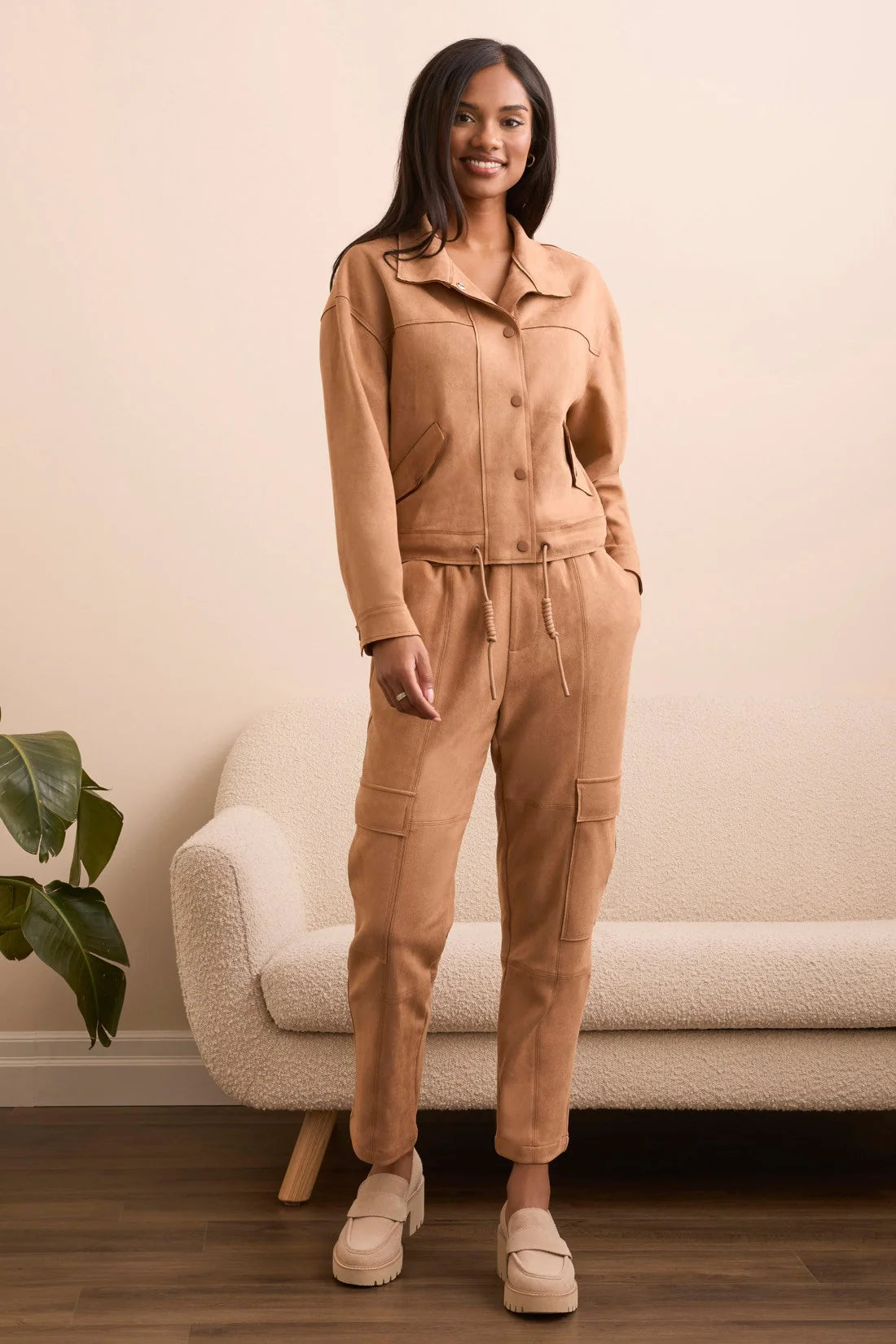 Complétez votre look avec une veste décontractée et raffinée, confectionnée en simili-suède doux, pour une finition élégante et contemporaine. Les épaules tombantes lui confèrent une silhouette décontractée qui se superpose facilement, tandis que les poches pratiques offrent une solution élégante pour ranger vos essentiels de voyage.