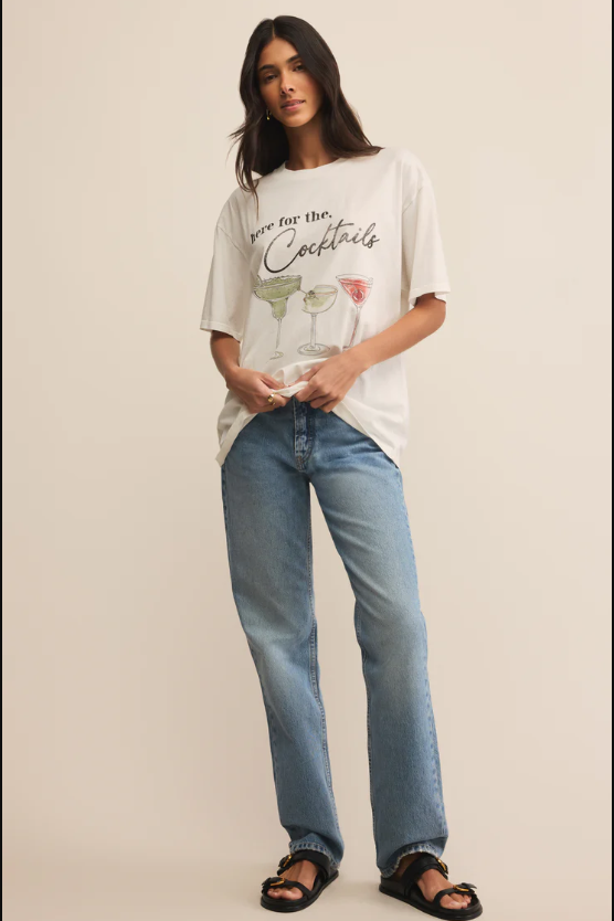 Votre t-shirt du week-end vient d'être modernisé. Confectionné en jersey de coton doux au toucher et délavage usé, ce modèle décontracté arbore un imprimé ludique « Ici pour les cocktails » avec des boissons colorées d'inspiration vintage au centre.